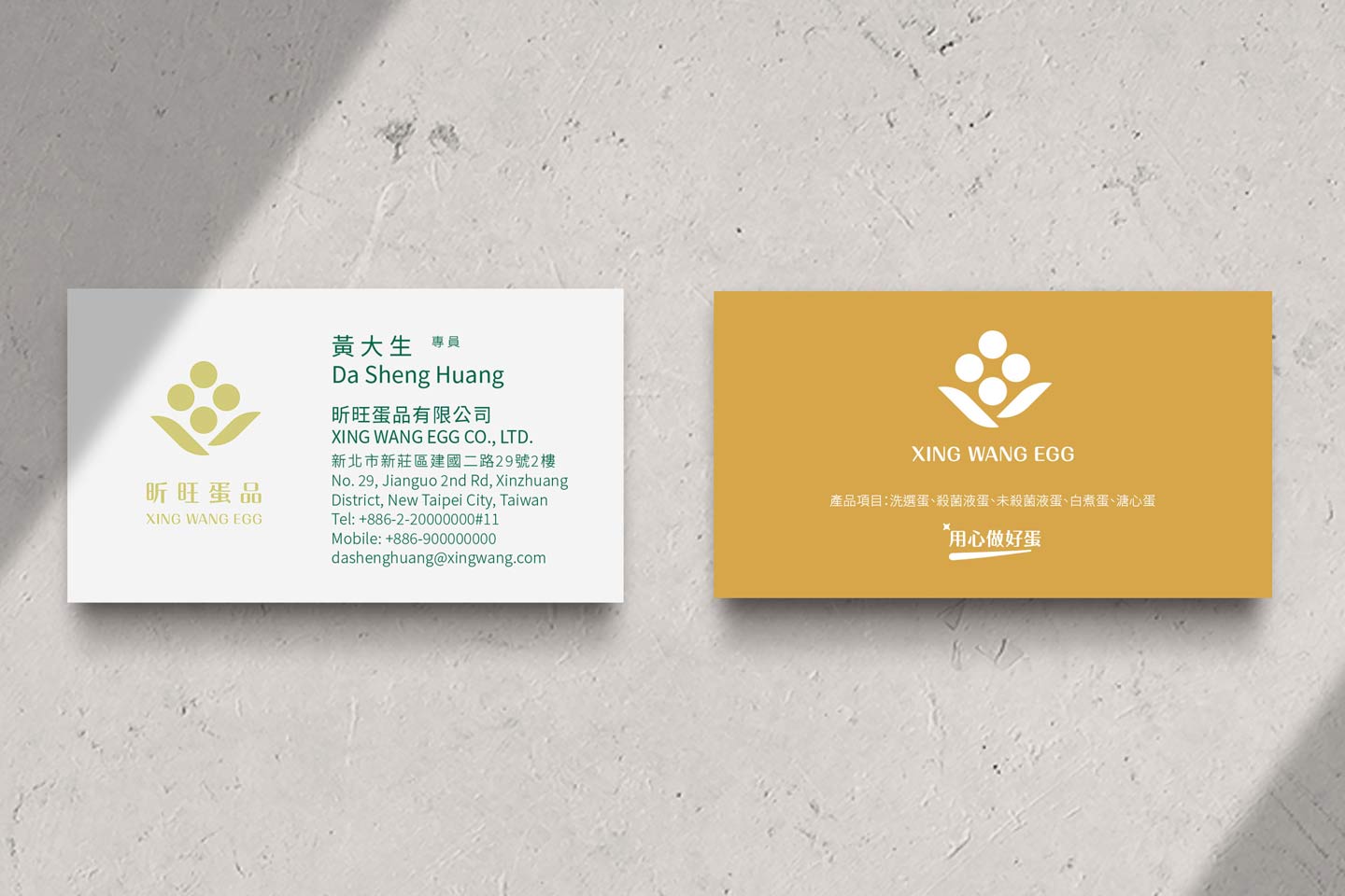 標誌主體由四個圓形元素組成,上方四顆圓點象徵新鮮蛋品,排列成穩定而向上的結構,代表每日嚴選、品質一致與生產流程的系統化管理;X形(Xing Wang)象徵清晨陽光。則為視覺核心,象徵品牌的初心與價值中樞,亦隱喻「一顆好蛋」來自層層把關與專業整合。整體圓形語彙傳遞出完整、安心與自然純淨的感受,呼應蛋品作為日常營養來源的基礎角色。